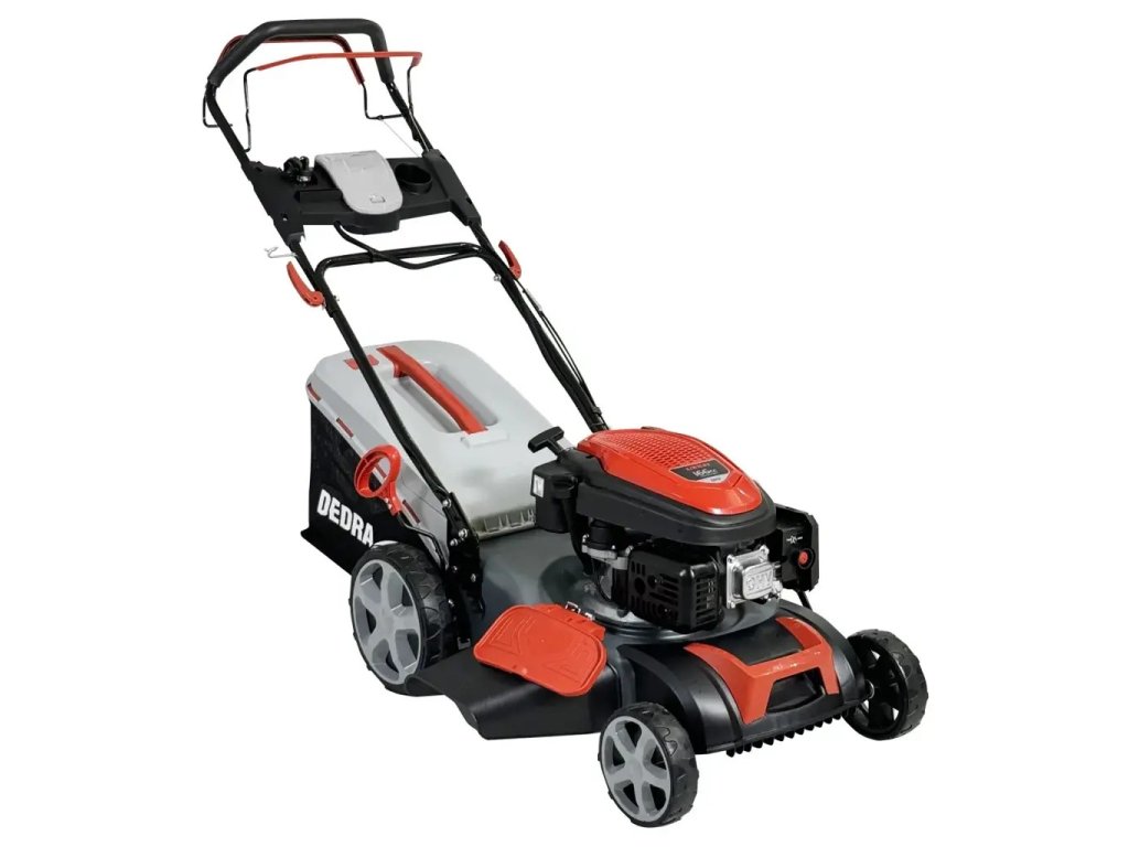 | benzínová sekačka: | DEDRA DED8724-46LSE benzínová sekačka s pojezdem s el. startérem, LONCIN 2,9kW, 46cm, centrální stav.výšky, koš 60l |